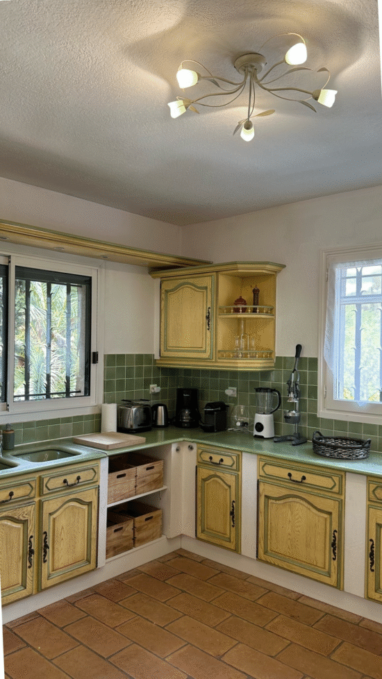 Autour d'un grand plan de travail, la lumière inonde cette cuisine très équipée avec vue sur la terrasse et la piscine. Vous pourrez y préparer et découvrir des plats provinciaux de toutes sortes.